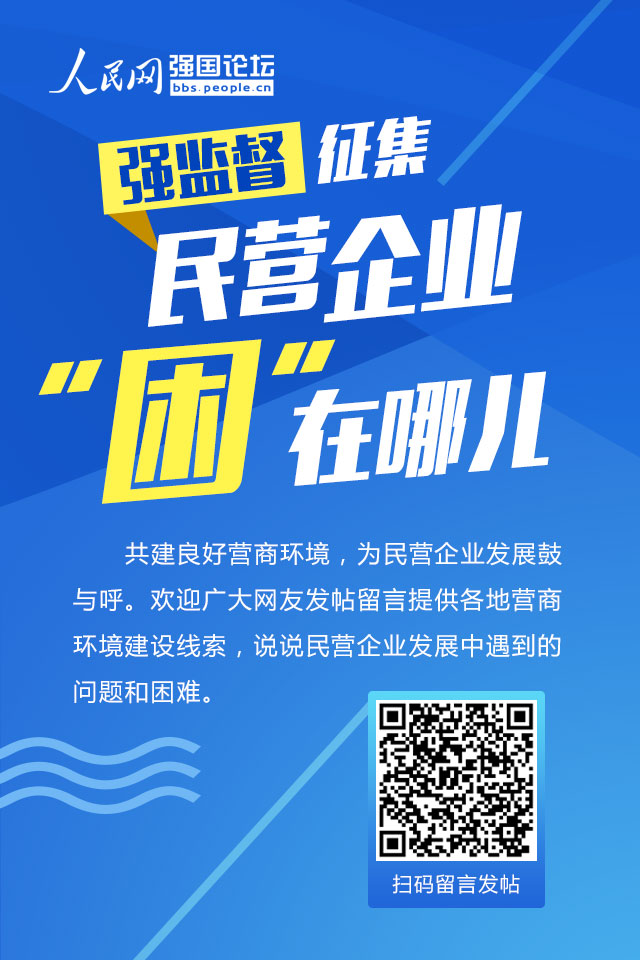 共建良好營商環(huán)境,為民營企業(yè)發(fā)展鼓與呼,人民網(wǎng)強(qiáng)國論壇開設(shè)“專項監(jiān)督”版塊,歡迎廣大網(wǎng)友發(fā)帖留言提供各地營商環(huán)境建設(shè)線索,說說民營企業(yè)發(fā)展中遇到的問題和困難,以期共同推動“糾正一些政府部門、大企業(yè)利用優(yōu)勢地位以大欺小、拖欠民營企業(yè)款項的行為”,為民營經(jīng)濟(jì)發(fā)展創(chuàng)造健康環(huán)境。