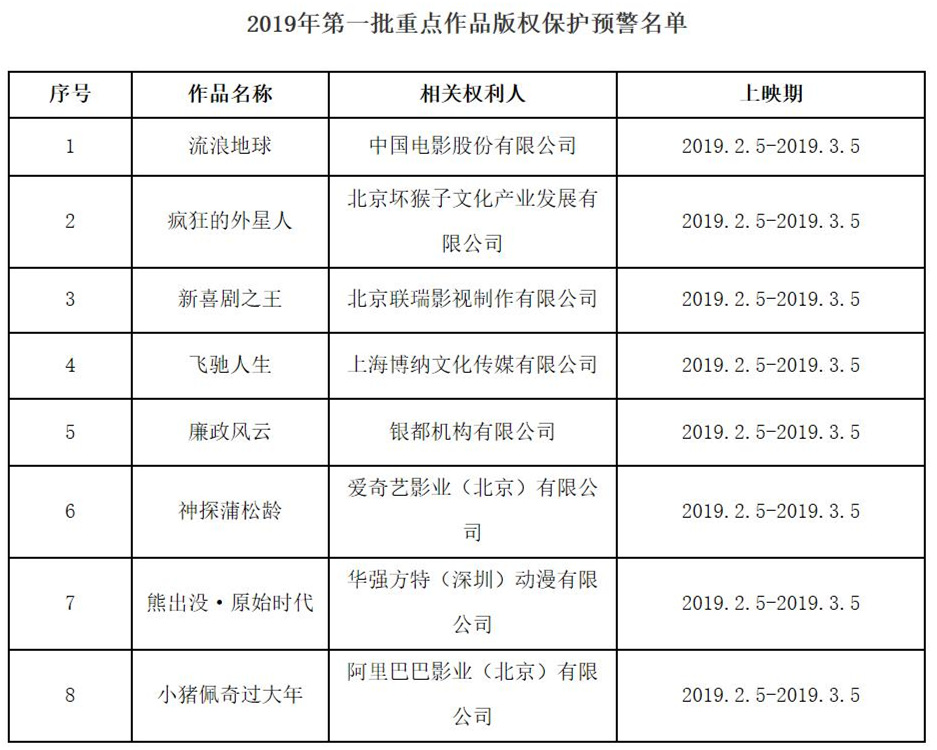 2019年度第一批重點(diǎn)作品版權(quán)保護(hù)預(yù)警名單,《流浪地球》等賀歲片在列。(國(guó)家版權(quán)局)