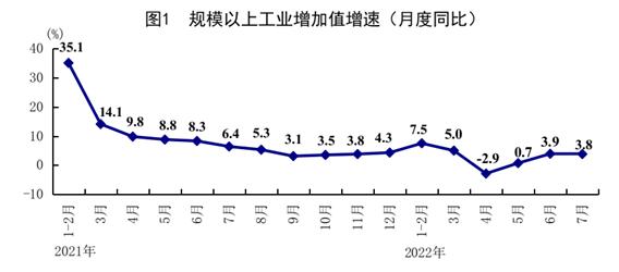 看工業(yè)。7月份,全國規(guī)模以上工業(yè)增加值同比增長3.8%,比上月回落0.1個百分點;環(huán)比增長0.38%。