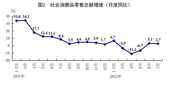 看消費。7月份,社會消費品零售總額同比增長2.7%,增速比上月回落0.4個百分點。