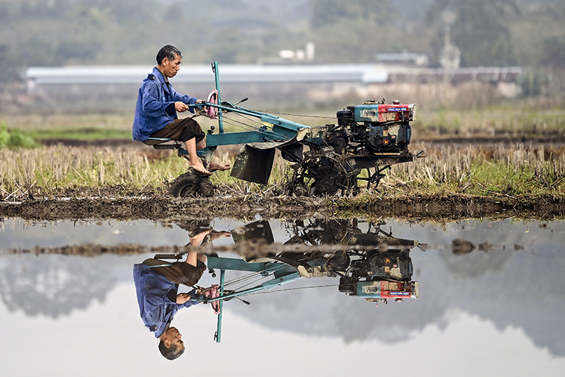 2月17日,廣西欽州欽北區(qū)大寺鎮(zhèn)農(nóng)民在翻耕稻田。新華社記者 張愛林攝